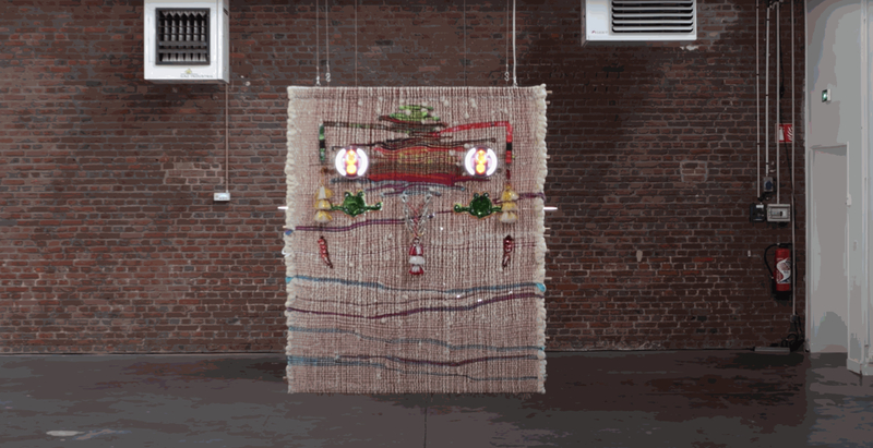 The museum writes: "From her first weavings, Kenia decided to incorporate light, in different forms. Woven, embroidered or even suspended in the middle of the pieces, this light passes through the compositions and imposes a rhythm on the works. Headlights from cars, scooters or trucks render certain pieces piercing and hypnotizing. Kenia's inspirations come from her dreams, which she transcribes and draws, as well as from Bolivian urban legends. She mixes these different references to compose a personal mythology imbued with symbolism."